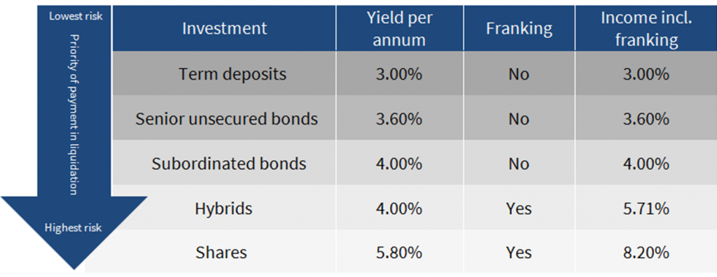 In any investment there are risks. Both the subordinated bond and the hybrid have call dates, typically after five years for the bond, but a range for the hybrid that could be up to eight years. However, the bond has a final maturity date, usually at 10 years, while the hybrid has conditional conversion dates subject to APRA approval.
