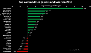 The graphic below shows the relative performance of a broad cross-section of commodities during 2019. The potential for further hostilities that interrupt the flow of crude oil from the Middle East to consumers around the world should keep a floor under the oil price. The Strait of Hormuz is likely to be a flashpoint as 20% of the world’s daily supplies flow through the seaway that separates the Persian Gulf from the Gulf of Oman. One can reasonably expect volatility in oil over the coming year, and the Middle East is likely to be a constant catalyst for price action. Since crude oil powers the world, the price action in the petroleum market will impact the prices of markets across all asset classes, including other commodities. Energy is a critical element when it comes to the production of all raw materials.