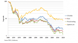 The graphic below highlights the declining purchasing value of currencies over the past 50 years.