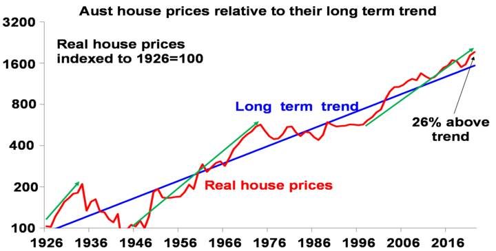 The past 100 years has seen 3 major long-term booms in Australian home prices – in the late 1920s, the post WW2 period and since the late 1990s. These are highlighted with green arrows in the next chart that shows real house prices back to 1926. The boom over the last 25 years has largely been driven by the shift from high interest rates to low interest rates and a surge in population relative to housing supply.