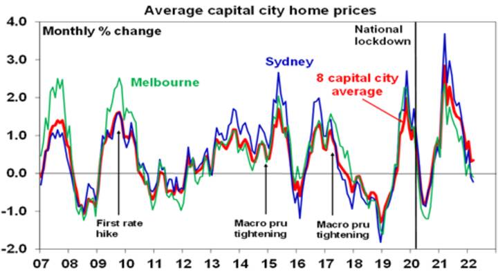 - RBA rate hikes. The RBA is expected to start hiking rates in June likely pushing variable mortgage rates up by nearly 1% by year end and by 1.5% by mid next year. Rough estimates suggest that a 1.5% to 2% rise in mortgage rates would reduce home buyer borrowing power and the ability to pay for a house by 10 to 15%. Note that RBA modelling suggests that a 2% rise in interest rates would lower real house prices by around 15% over a two-year period.