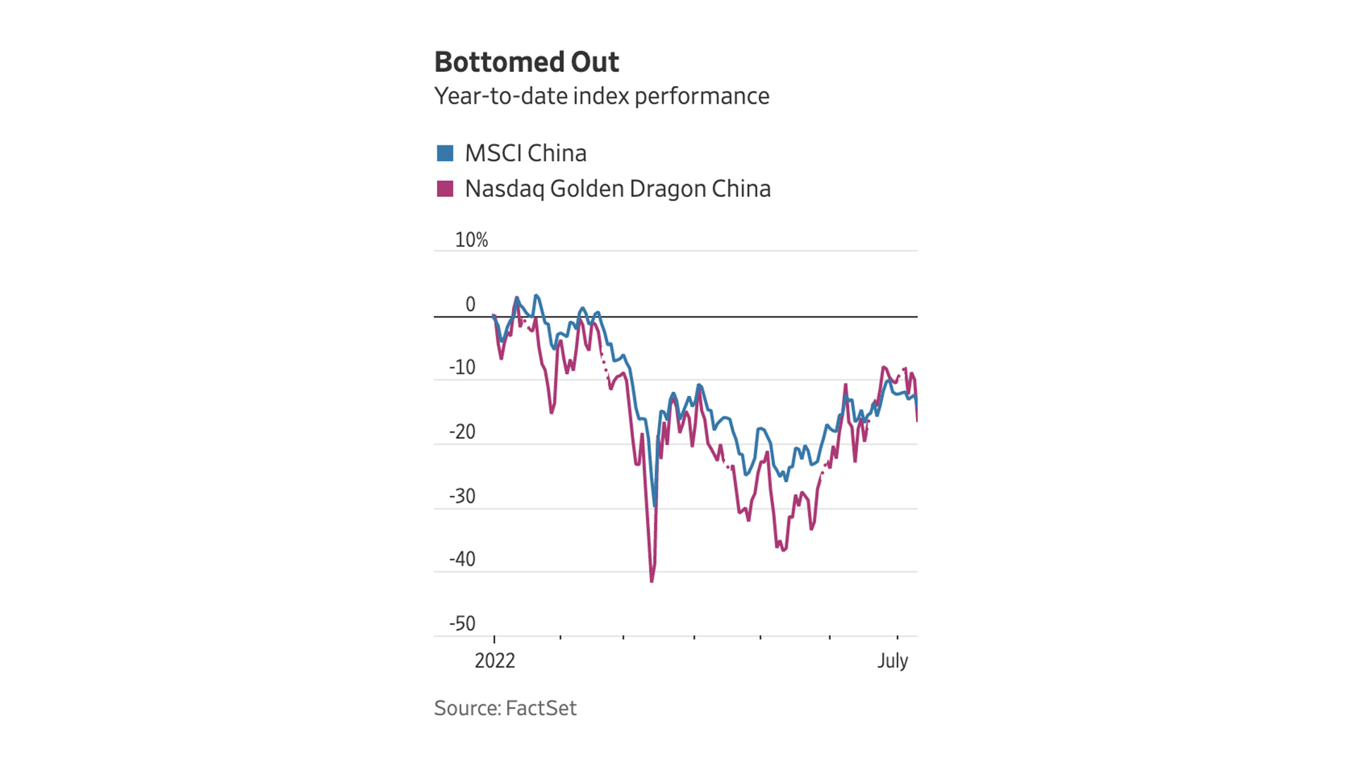 The MSCI China Index, which slid to a five-year low in March, has recovered some losses but was still down 14 per cent in the year to date as of Monday. The Nasdaq Golden Dragon China Index, which includes dozens of U.S.-listed Chinese companies’ ADRs , was down 16 per cent for the year.